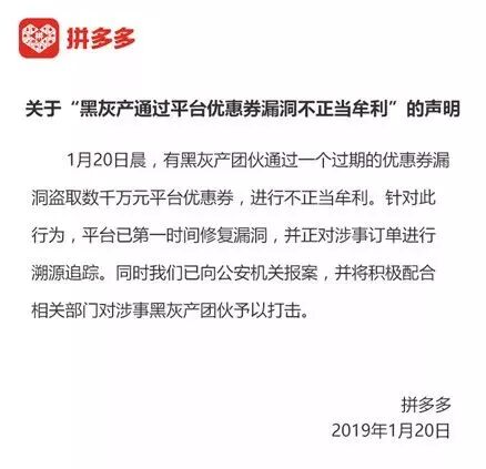 20日下午1点,拼多多发布官方声明,称有黑灰产团伙通过一个过期的优惠券漏洞盗取数千万元平台优惠券,进行不正当牟利。目前平台已修复规则漏洞,并已向公安机关报案。
