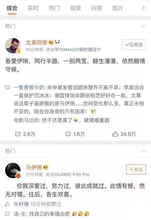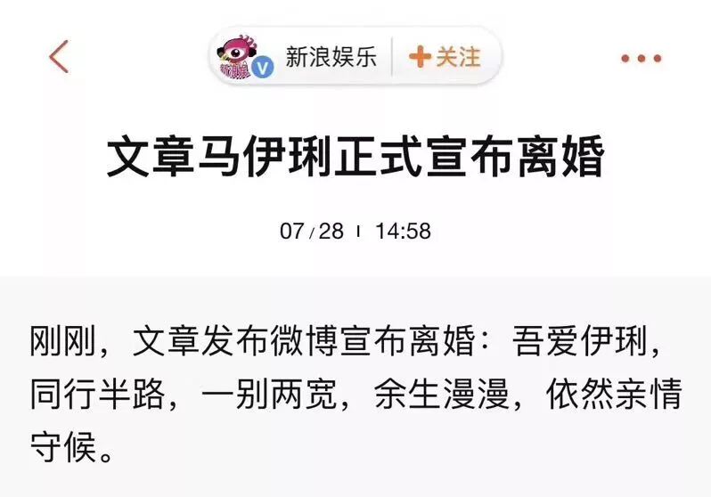 7月28日下午,文章、马伊琍先后发文宣布正式离婚,“同行半路,一别两宽,余生漫漫,依然亲情守候””此情有憾,然无对错。往后,各生欢喜”,曾经的且行且珍惜,终究是爱已成往事。